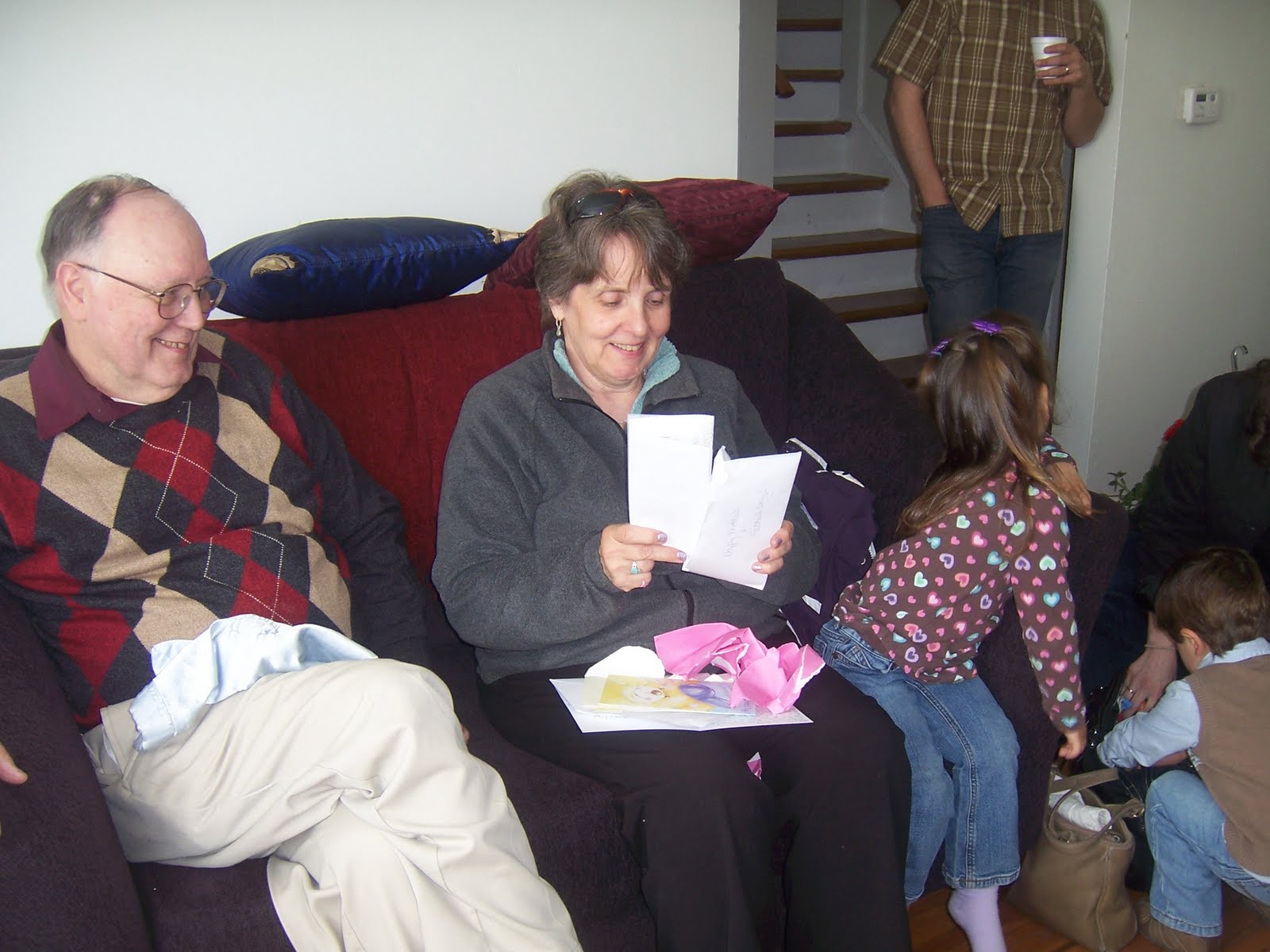 Shortly after dinner, we gave the mothers their presents. I bought my grandmother two African violets. I always remember my grandmother having African violets in her home. My mom and dad were pleased with their tickets, and I think Steve's mom really loved the movie tickets, too. (I have to say sometimes I'm a little jealous that our parents have all this time to do lots of fun things with each other whenever they want too, but I am so in love with being with my children every day, and Steve and I are creative in finding pockets of time for each other. We really do need to make more time for ourselves, though. I think my recent trip to the ER proved that.)